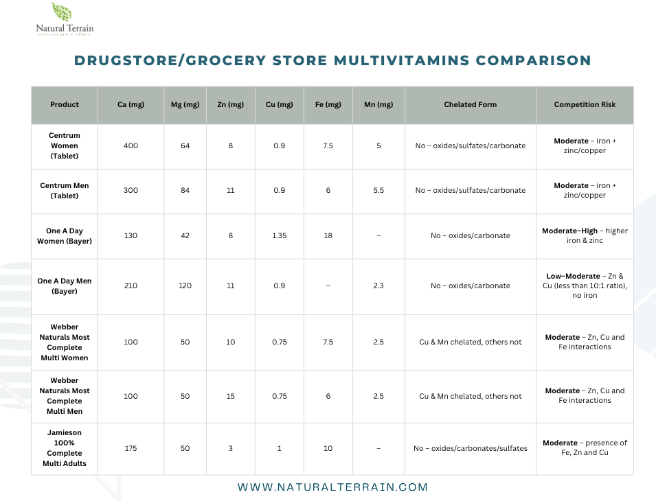 Here is a comparison chart of multivitamins from professional brands commonly prescribed by Naturopathic Doctors: